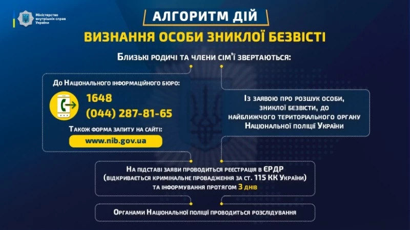 Якщо громадяни не мають інформації про місце перебування родича, то вони можуть звернутися до Національного інформаційного бюро за коротким номером 1648, міським номером (044) 287-81-65 чи заповнити відповідну форму для запитів на сайті.