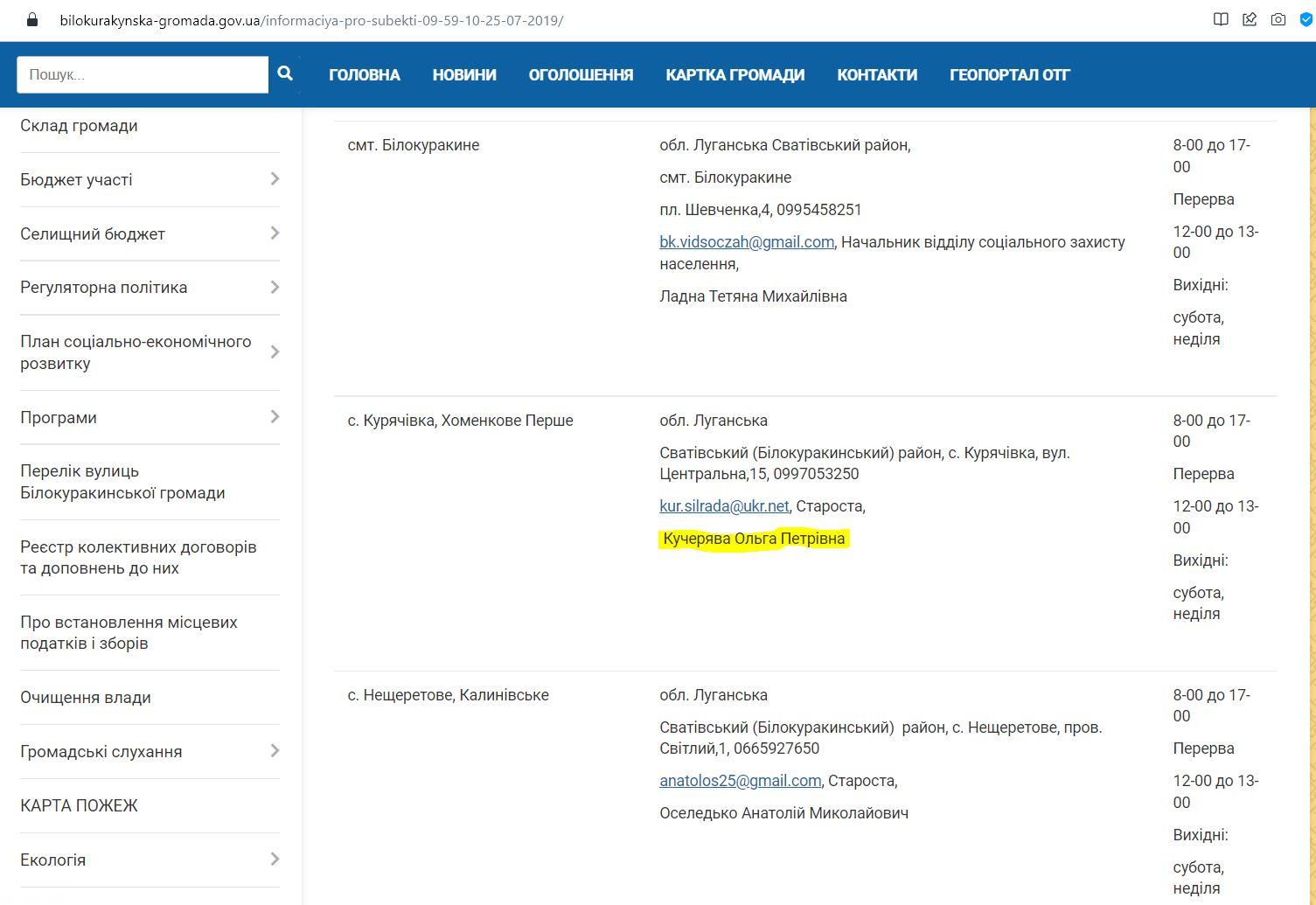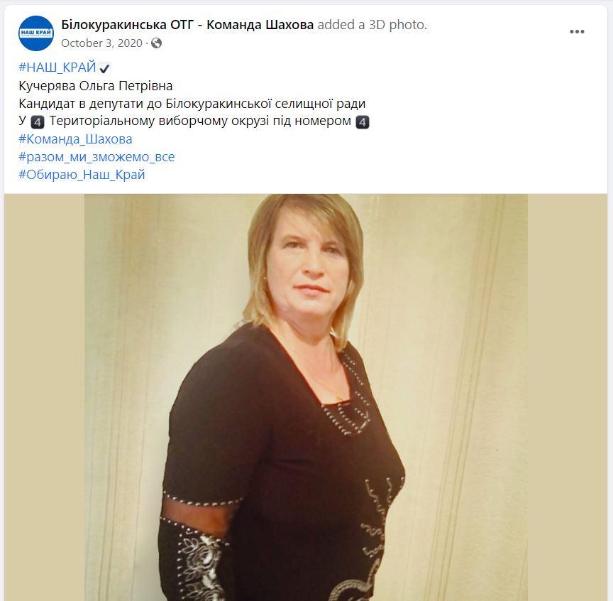 Посаду «в.о. глави адміністрації» району окупанти віддали Ользі Кучерявій. До того вона працювала старостою сіл Курячівка та Хоменкове Перше спочатку Білокуракінського, а після адмінреформи – Сватівського району. Села входили до власне Білокуракінської ОТГ.