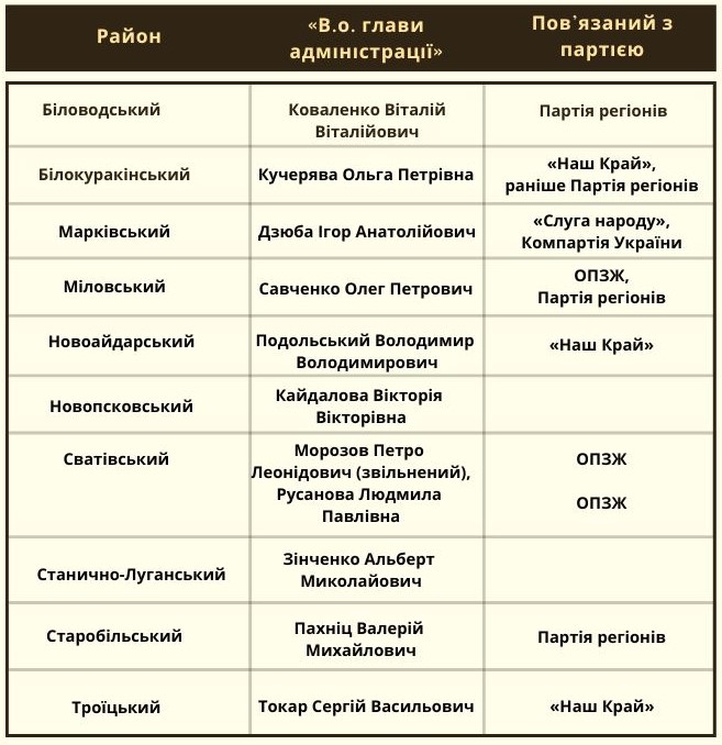 Деякі імена досить добре знані в регіоні, про інших відомо менше. Знайомство почнемо із партійних зв’язків цих людей. Перед цим необхідно зауважити, що після окупації була скасована адміністративна реформа, проведена в Україні. Тож замість укрупнених районів керівництво призначалося у межах колишніх районів Луганської області.