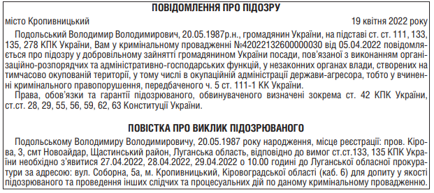 22 квітня 2022 поліція повідомила Кучерявій про підозру в державній зраді і оприлюднила повістку. Та, звісно, поки що «в.о. глави» прислужує окупантам на тимчасово окупованій території.