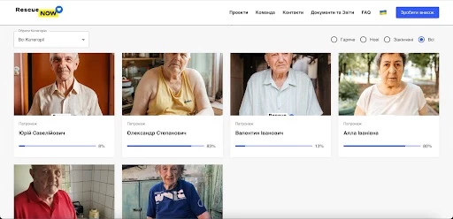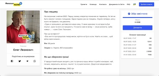Ще один напрямок допомоги у “Rescue.now” – патронаж. Він діє лише у Харкові та області. У рамках нього волонтери збирають звернення на «гарячу лінію» від самотніх літніх людей, які опинились у складному становищі та потребують допомоги.