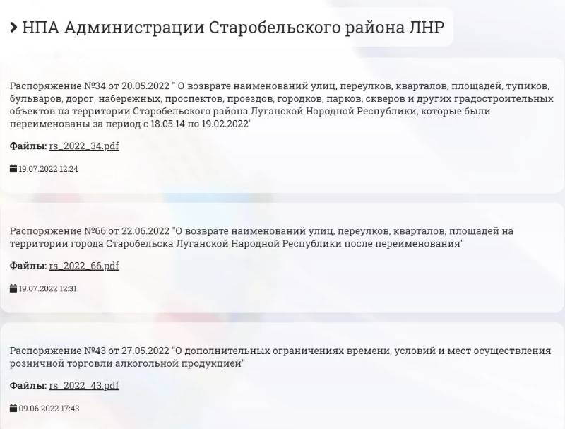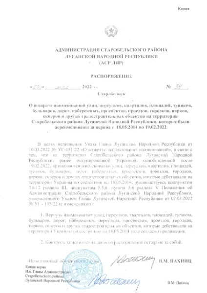 "Так званий "виконуючий обов'язки голови адміністрації Старобільського району" Валерій Пахниць підписав "розпорядження" про повернення вулицям, провулкам, кварталам та площам Старобільського району назв, які використовувалися до декомунізації. Тобто, Лєніна, а не Слобожанська, Комунарів замість Центральна і так далі", - написали в повідомленні.