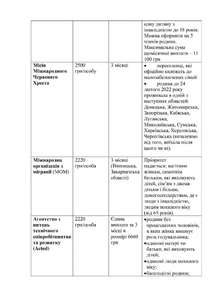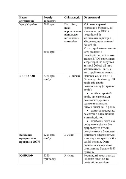 Перші виплати розпочалися ще у березні. Але з червня дещо змінилися критерії вразливості, щоб отримати допомогу. Наприклад, від Управління Верховного комісара ООН у справах біженців (УВКБ ООН). Виплати надаються в розмірі 2220 гривень на кожну особу протягом трьох місяців. Наразі подати заявку на отримання цього виду грошової допомоги можуть ВПО, які належать хоча б до однієї із зазначених категорій: