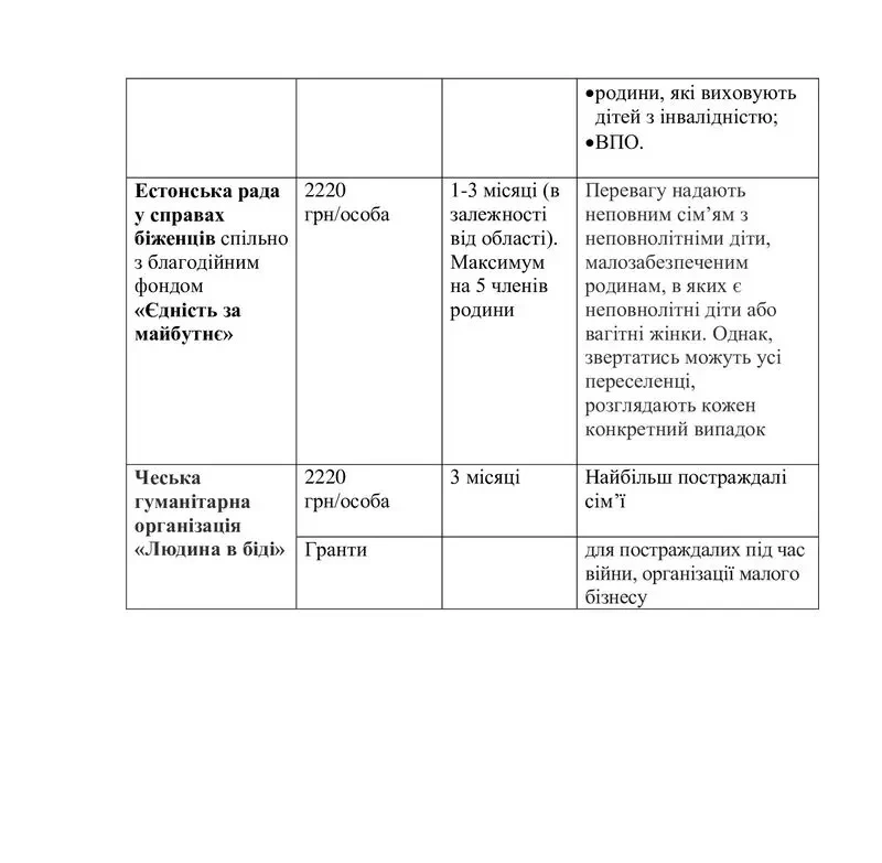 Чеська гуманітарна організація "Людина в біді" (Peopli in Need або PIN) пропонує трохи інший підхід. Їх проєкт передбачає надання грантів для постраждалих під час війни. Мова, в тому числі, про грошову допомогу для відновлення малого бізнесу. За необхідності надаються засоби до існування і найбільш постраждалим сім’ям – ті самі 2220 гривень на місяць на особу впродовж трьох місяців. Гаряча лінія організації: 0 800 210 174, номер у мессенджерах: 099 767 37 06.