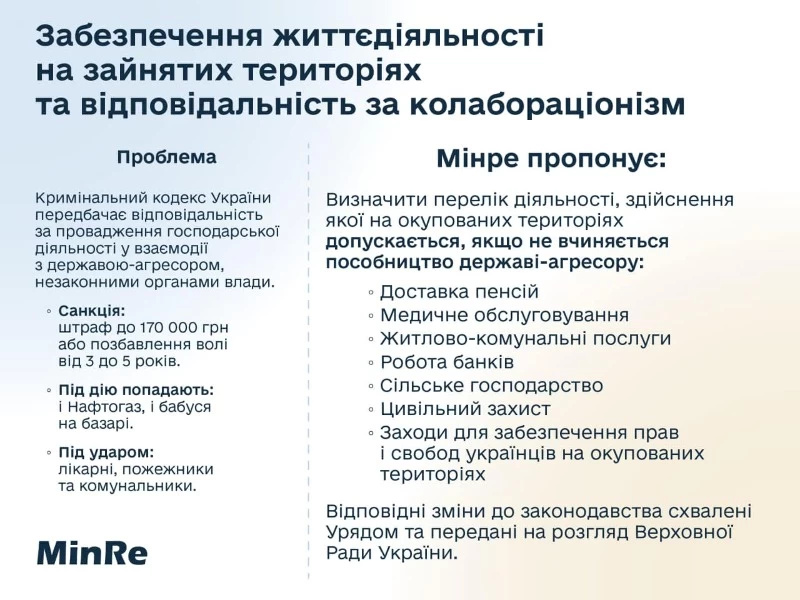 В Мінреінтеграції зазначають, що до них почали надходити сотні звернень: люди просять роз’яснити, чи підпадає та чи інша діяльність під кримінальний кодекс. У відповідь на це міністерство утворило робочу групу з понад 160 представників органів влади, бізнесу, фахівців права, громадських організацій, яка й напрацювала два законопроєкти, що чітко дають зрозуміти, яка діяльність не є колабораціонізмом. Зокрема, уточнюється, що караним буде лише добровільне здійснення господарської діяльності у взаємодії з агресором. Також пропонується визначити перелік видів діяльності, здійснення яких на ТОТ допускається, якщо при цьому не здійснюється пособництво агресору. Уряд зможе встановлювати особливості та додаткові обмеження провадження такої діяльності.
