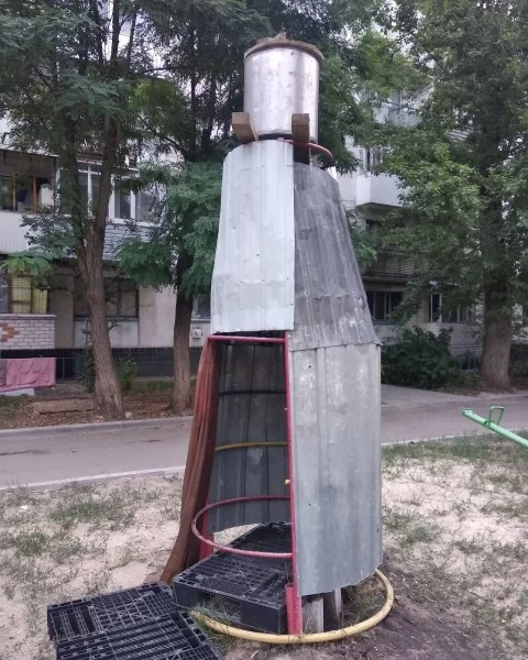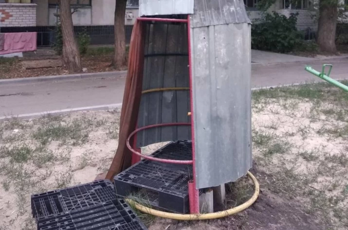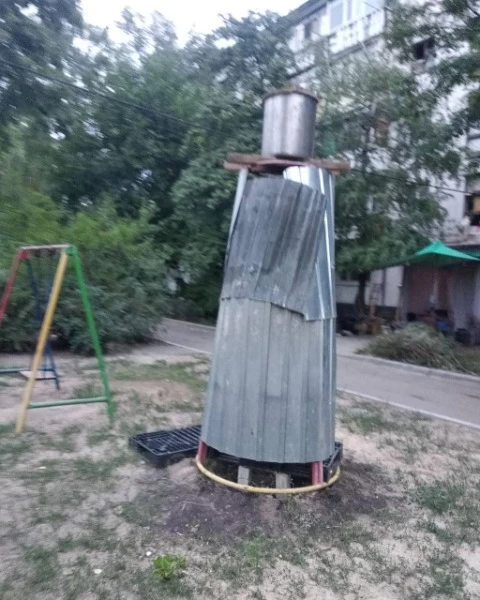 Після окупації російськими військами Рубіжного 12 травня, жителі досі не можуть дочекатися води, світла, газу. Хоча з перших днів окупанти обіцяли, що якнайшвидше налагодять комунікації. Рубіжанам доводиться виживати самостійно, тому просто на дитячому майданчику люди облаштували душ, обгорнувши пірамідку металевими листами. Фото опублікував Telegram-канал Rubizhne_1896.