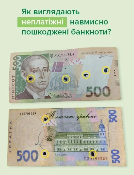 НБУ попереджає бізнес та громадян, що такі банкноти пофарбовані, розрізані або з отворами - не потрібно приймати під час готівкових розрахунків. Адже ці банкноти перестали бути платіжним засобом. Банки не мають права здійснювати обмін фізичним та юридичним особам пошкоджених вищезазначеними способами банкнот, а повинні вилучати їх, надсилати Національному банку для дослідження та інформувати про подібні випадки правоохоронні органи.