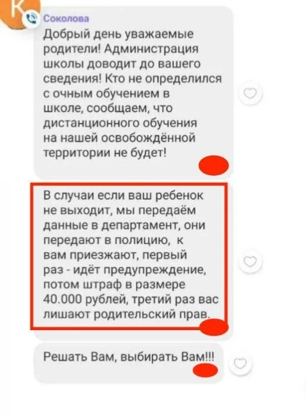 Там також розповіли, що спершу загарбники погрожують надсилати попередження, потім штраф у розмірі 40 тисяч рублів, а потім і позбавленням батьківських прав.