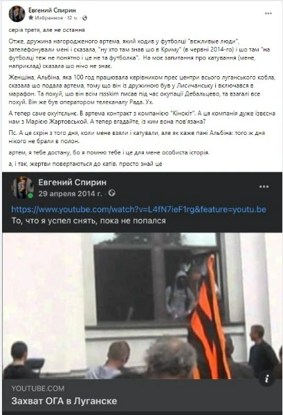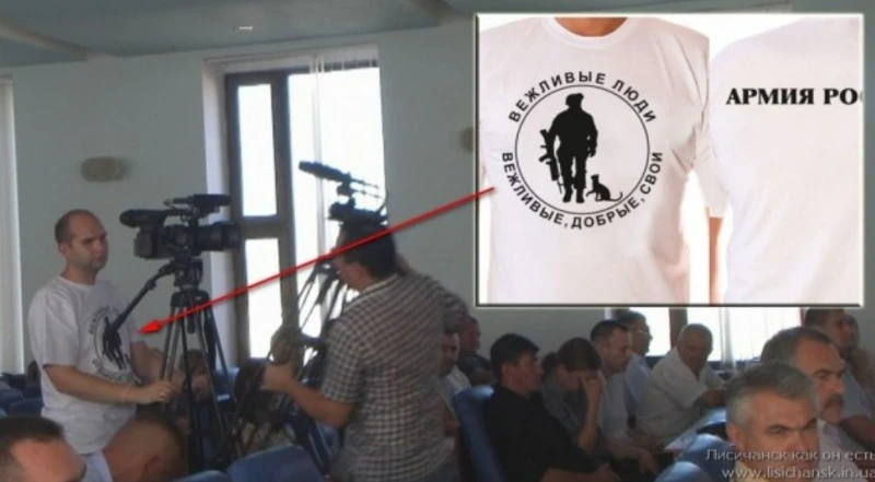 За словами Спіріна, кореспондент телеканалу "Рада" в Луганській області Артем Весько, який ходив у футболці "вежливые люди" та підтримував російську агресію в 2014-му. Тоді він працював оператором Лисичанської ТРК "Акцент".