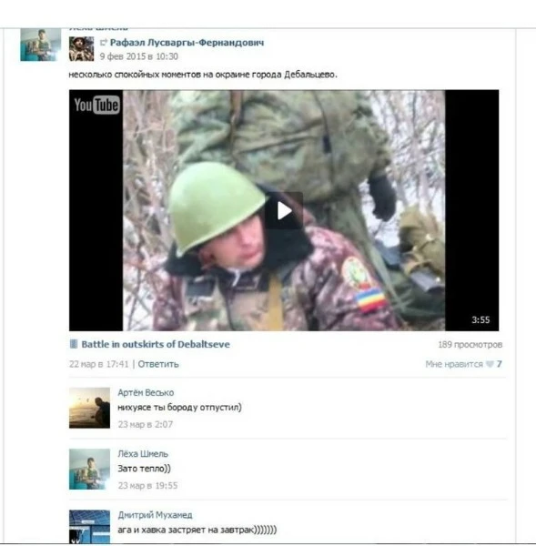"Оце пости Артема під відосами лусваргі, помнітє, хто це? Як його витягували з лаври? А памʼятаєте, був такой батальон "пятнашка"? Ага. Так ото туловіщє якому пише камєнт ортьом — це його лєпший кєнт і він на відео лусваргі, з-під Дебальцево", - розповів журналіст.
