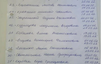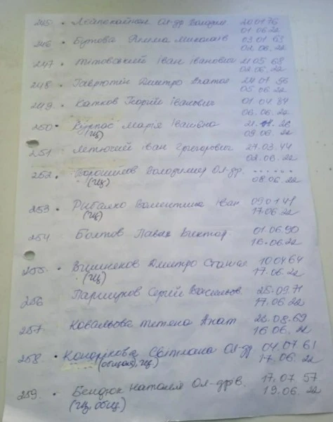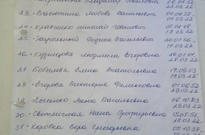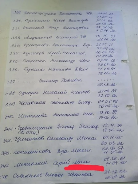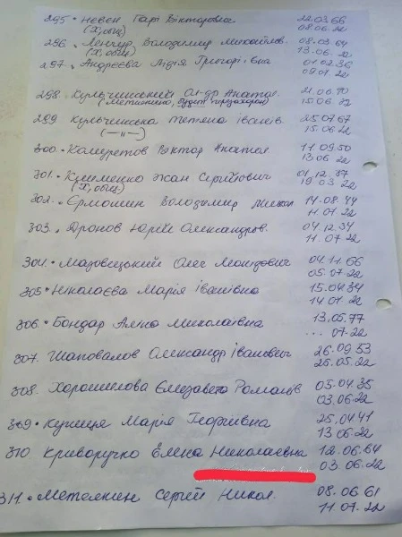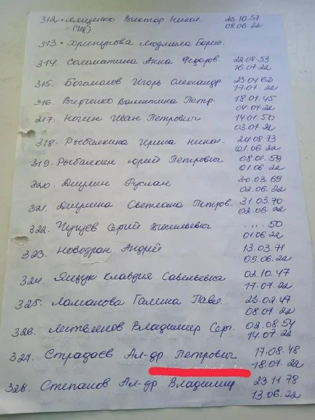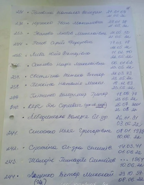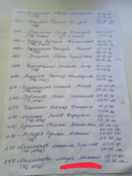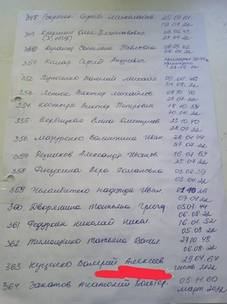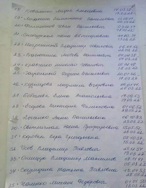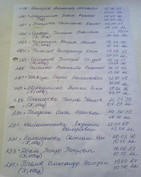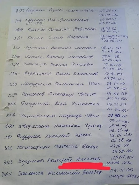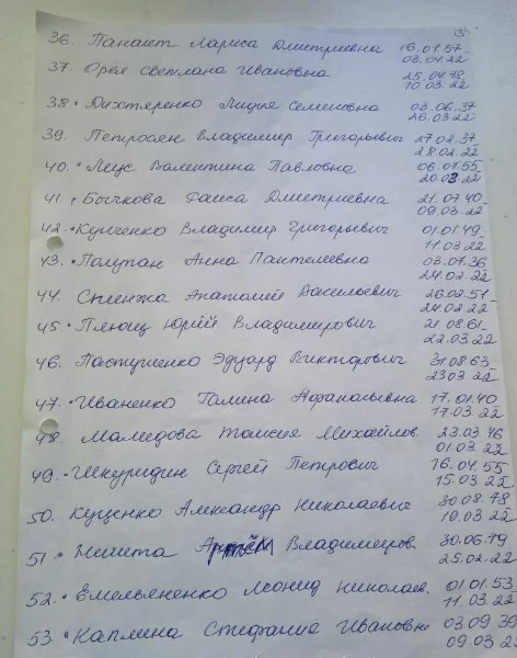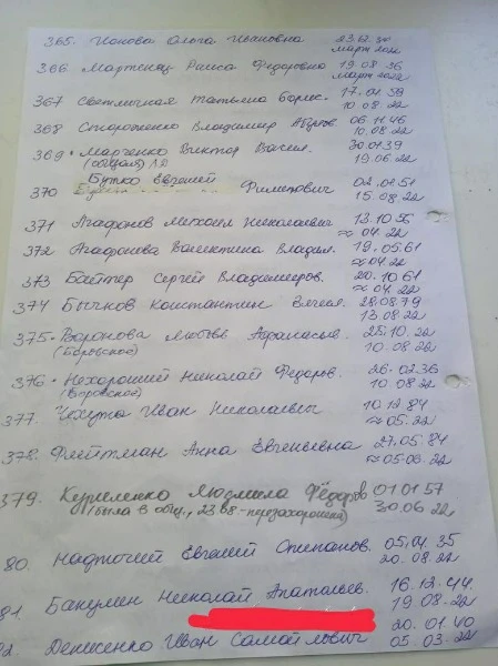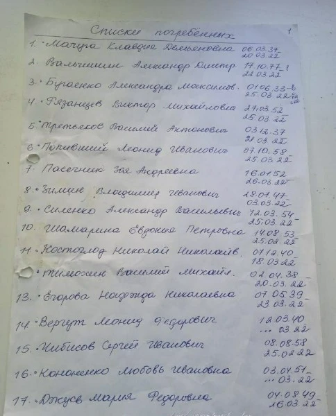 В місцевих Telegram-каналах опублікували списки загиблих людей у Сєвєродонецьку. У списках зазначені люди, що захоронені починаючи з 6 березня. Так, на фото можна побачити біля деяких імен "была в общей". Ймовірно, через тодішні обстріли окупантів люди не могли нормально захоронити тіла, тому доводилось робити колективні могили.