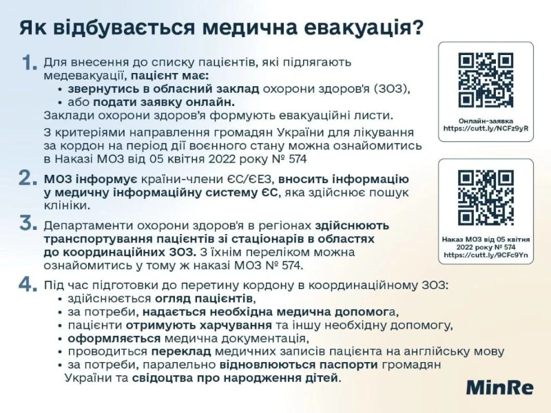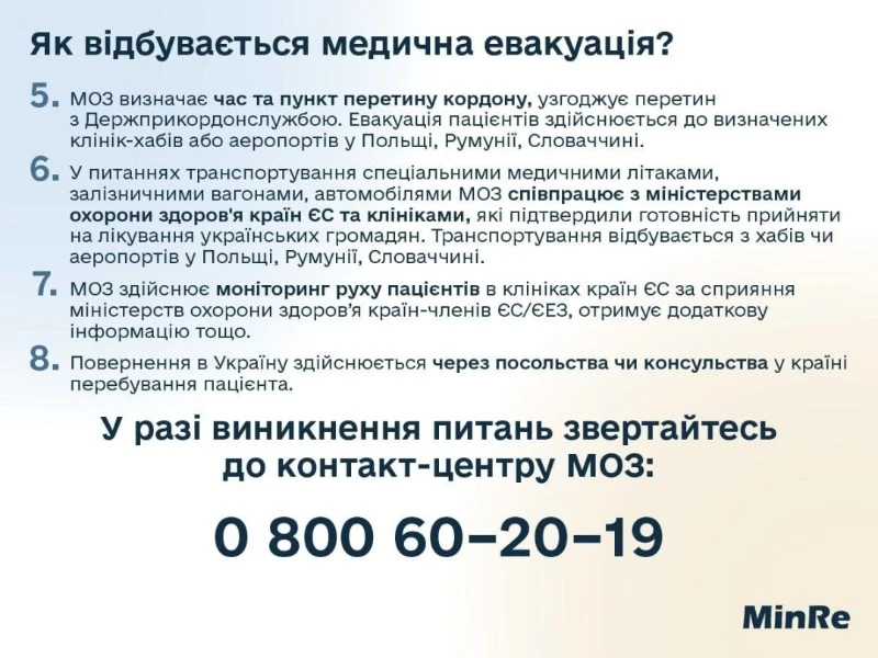 В установі зазначили, що МОЗ визначає час та пункт перетину кордону, узгоджує перетин з Держприкордонслужбою. Уточнюється, що евакуація пацієнтів здійснюється до визначених клінік-хабів або аеропортів у Польщі, Румунії, Словаччині.