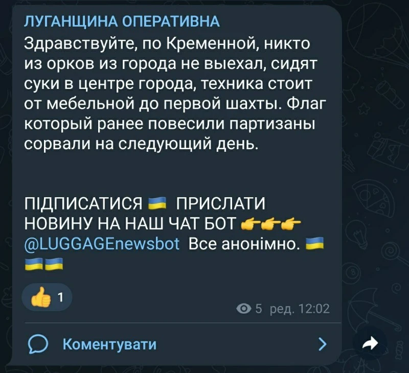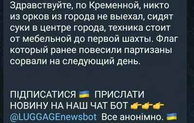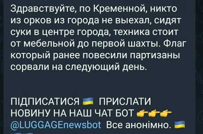 "По Кремінній, ніхто з орків з міста не виїхав, сидять с*** в центрі міста, техніка стоїть від меблевої до першої шахти. Прапор, який раніше повісили партизани, зірвали на наступний день", - пише житель окупованої Луганщини.