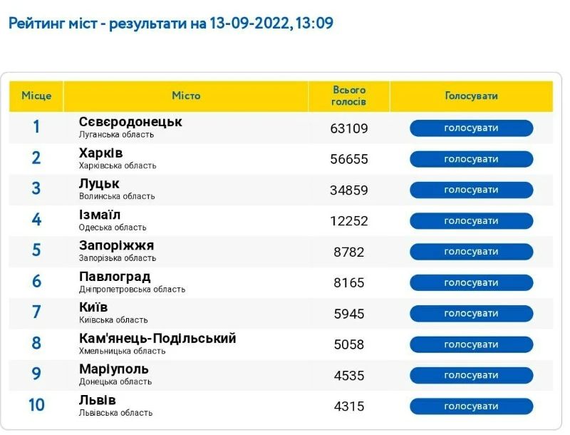Додамо, що підсумки голосування будуть підведені 30 грудня 2022 року. Жителі Луганщини намагаються підтримати рідне місто, що нині окупували росіяни. Проголосувати можна за посиланням: https://mistoua.com.ua/