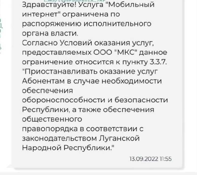 "Призупинити надання послуг Абонентам в разі необхідності забезпечення обороноздатності та безпеки Республіки, а також забезпечення громадського правопорядку відповідно з законодавством Луганської Народної Республіки", - йдеться у розпорядженні окупантів.