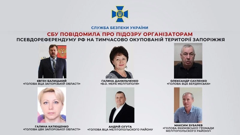 На тимчасово окупованій частині Запорізької області підозру від СБУ отримали "голова військово-цивільної адміністрації Запорізької області" Євген Балицький, "виконуюча обов'язки мера" Мелітополя Галина Данильченко, "голова військово-цивільної адміністрації Бердянська" Олександр Сауленко та "голова центральної виборчої комісії" Запорізької області Галина Катющенко.