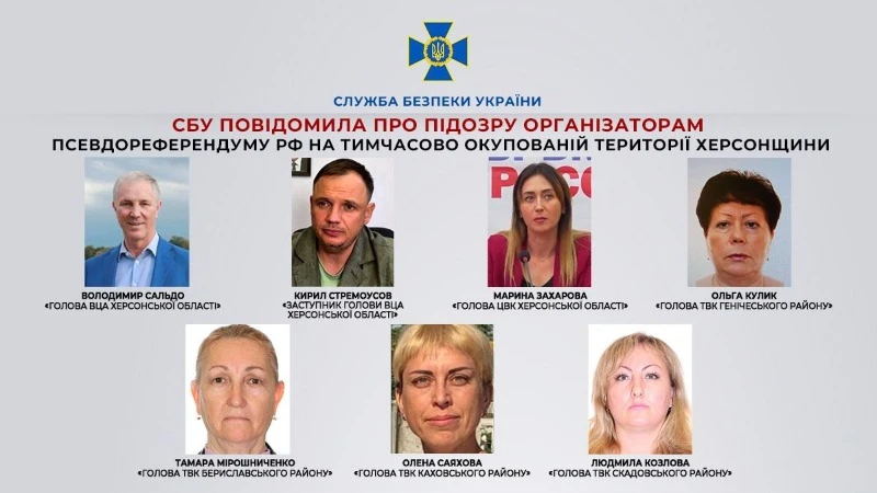 На тимчасово окупованій частині Херсонської області підозру СБУ отримали "голова військово-цивільної адміністрації" Херсонської області Володимир Сальдо, його "заступник" Кирило Стремоусов, "голова центральної виборчої комісії" Херсонської області Марина Захарова.