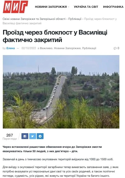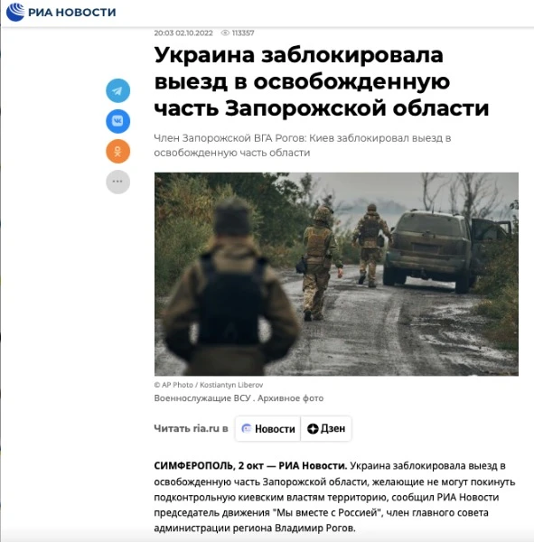 Російські ЗМІ із посиланням на колаборанта російських окупантів Володимира Рогова заявляють, що Україна нібито заблокувала в’їзд на «звільнену частину Запорізької області», і тепер «охочі не можуть покинути підконтрольну київській владі територію». Зокрема, Рогов заявив, що «людей не випускають з того боку з різних надуманих причин та з погрозами».