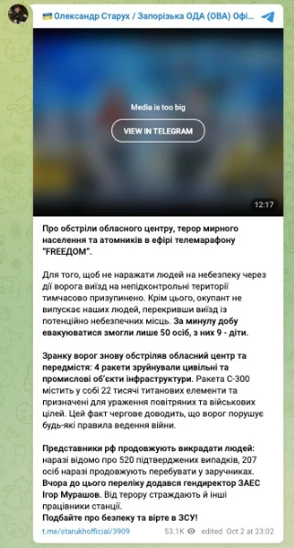 «Для того, щоб не наражати людей на небезпеку через дії ворога, виїзд на непідконтрольні території тимчасово припинено. Крім того, окупант не випускає наших людей, перекривши виїзд із потенційно небезпечних місць. Минулої доби евакуюватися змогли лише 50 осіб, із них 9 – діти».