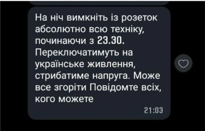 У соціальних мережах та месенджерах поширюють повідомлення, що нібито о 23:30 через переключення електромережі на «українське живлення» будуть «стрибки напруги», тож може «все згоріти». Повідомлення поширили й деякі органи місцевого самоврядування. Це — фейк.