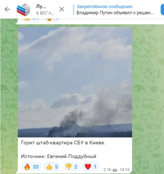 “Відомі російські пропагандисти поширили фейк, що ракети влучили в будівлі Служби безпеки України та Офісу Президента України, а також Верховної Ради України. Насправді пропагандисти сплутали купол Київського міського будинку учителя з куполом Верховної Ради, яка розташована в іншому місці. Російські терористи воюють проти мирних мешканців та української культури, тому на вулиці Володимирській у Києві російські ракети пошкодили університет імені Тараса Шевченка, музей Ханенків, музей Шевченка, дитячий майданчик у парку Шевченка та житлові будинки у центрі столиці. Всі органи влади працюють і тримають зв'язок із громадянами України.