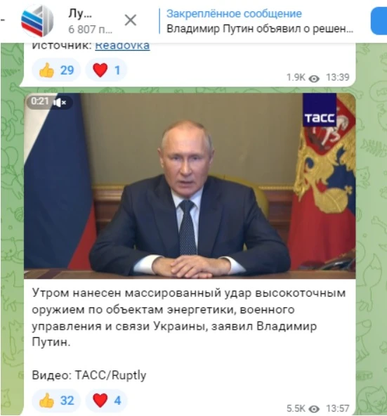Так, наприклад, “ГТРК ЛНР” на своєму каналі зробило декілька публікацій про влучання “високоточною зброєю в об’єкти енергетики, військового управління та зв'язку України”. В цілому, майже всі локальні пропагандистські ресурси весь день супроводжували цю тему.