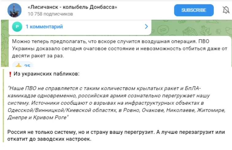 При цьому на деяких каналах також використовувалася теза, що українська ПВО нібито не може впоратися з ударами росіян, що є цілковитою нісенітницею.