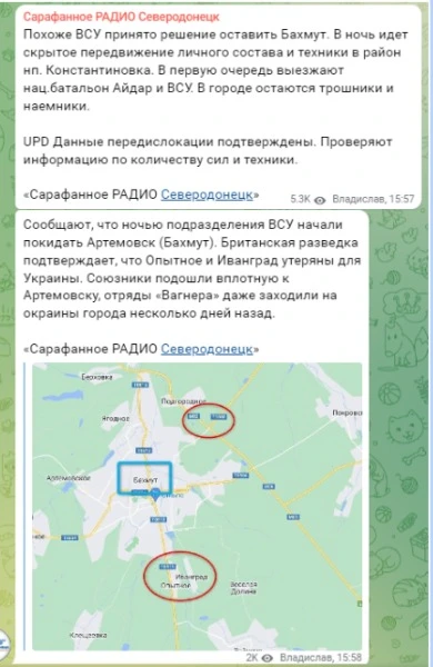 Так, Телеграм - канал “Сарафанное радио Северодонецк” 13 жовтня написав, що ЗСУ нібито прийняли рішення покинути Бахмут: