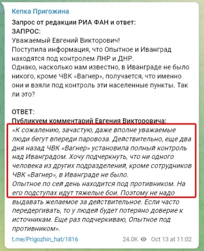 Цей фейк пропагандистів спростували самі окупанти. Так, на каналі “Кепка Пригожина” написали: