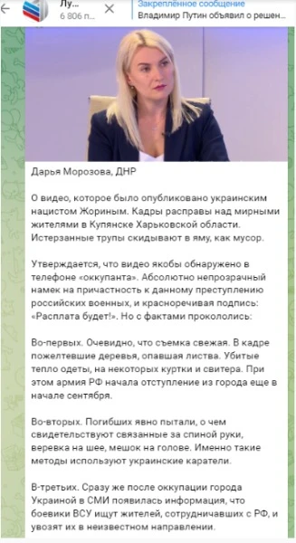 Росіяни стверджують, що за метаданими відео стає зрозуміло, що його було знято 9 жовтня, за годину до публікації, коли Куп'янськ уже давно контролювали "нацистські підрозділи України".