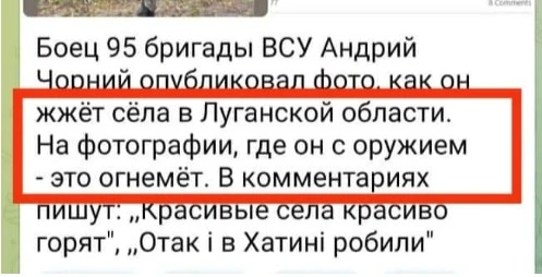 У другому випадку військовослужбовець ЗСУ Андрій Чорний опублікував фото, на фоні палаючого будинку і пояснив, що всередині знаходились загарбники. Це миттєво підхопили ресурси пропагандистів, які приписали українцям вбивство мирних мешканців та порівняли це з Хатинською трагедією.