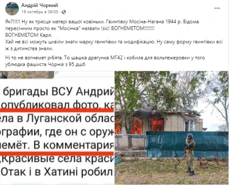 Ні то не вогнемет рібята. То шашка драгунка МГ42 і кобила для вольтежеровки у того ублюдка фашиста Чорнія з 95 дшб”, - іронічно прокоментував військовий фейк окупантів.