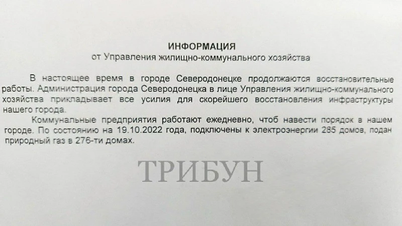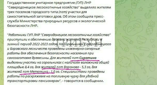В той же час т. зв. "Сєвєродонецьке лісомисливське господарство" виділило жителям трьох населених пунктів Сєвєродонецького району в лісі ділянки, з яких вони можуть самостійно заготовляти дрова. Таким рішенням окупанти дали зрозуміти людям: якщо в містах ще будуть намагатися провести опалення, то для них однозначно – ні.