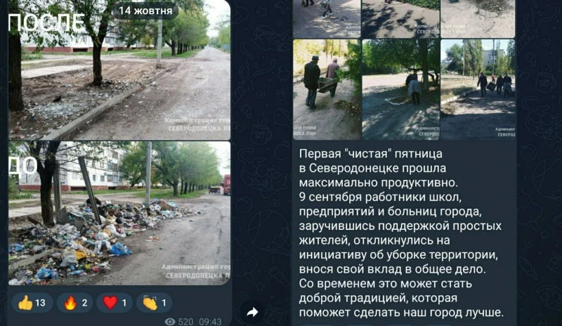 Окупаційна влада Сєвєродонецька активно розповідає про те, що вони налагоджують життя міста, але по факту роблять це за рахунок "живої робочої сили". Так, у Сєвєродонецьку запровадили "чисті п’ятниці", на яких жителі міста збираються та прибирають сміття, якщо коротко - виконують роботу комунальних служб. Станом на 14 жовтня окупанти публікують фото, на якому прибрана купа сміття, а місто в окупації вже десь 4 місяці.