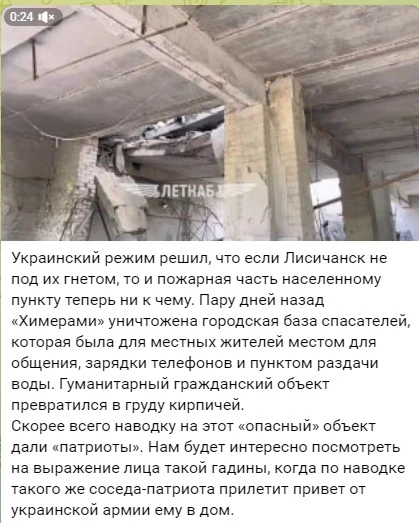 On the LENTAB channel, propagandists stated that the Ukrainian Armed Forces had fired at a rescue station in Lysychansk, which, according to them, "was a place for local residents to communicate, recharge their phones, and collect water." It is interesting that the news about the shelling of the fire station for a very long period of time is absent both in the Ukrainian mass media and social networks, and in media and resources controlled by the Russians. On September 28, shells really hit the building of the water supply company, in which one of the headquarters for the organization of the pseudo-referendum was located. In addition, the strike was carried out at night, when the civilian population was not there. The same resource in one of the following publications writes about the attack on the college in Novoaidar: "Among the objects, information about which the Ukrainian Armed Forces were interested in, there were exclusively civilian objects located in Novoaidar raion", but again - according to mass reports from locals, the college building was occupied by Russian invaders, not refugees, as channel administrators claim.