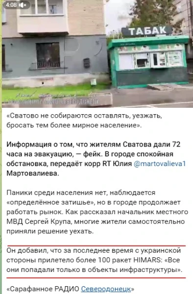 Another local propaganda resource "Sarafannoe Radio Sievierodonetsk" with reference to the leader of the "Svatove Ministry of Internal Affairs" Serhii Krupa wrote that in a few days "more than 100 HIMARS missiles had been launched to Svatove and that all of them had hit "only infrastructure objects". Following their logic, Ukraine used particularly valuable ammunition that cost at least 10.5 million dollars (the cost of the GMLRS to HIMARS missile is from 105-150 thousand dollars, depending on the year of manufacture), in order to destroy civilian objects on its own territory, which, moreover, the government had built before. And this is only in Svatove raion in a few days. In addition, it should be taken into account that there are not many MLRS of this type in the arsenal of the Armed Forces of Ukraine and not all of them are focused on this direction, and the use of high-precision GMLRS in such a quantity in one small area is simply impractical.