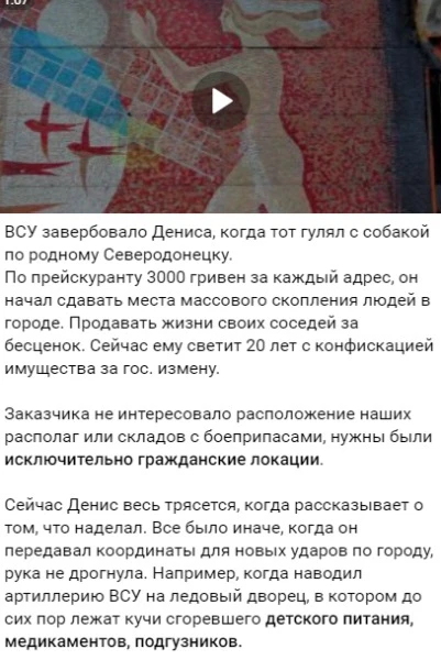 A few days later, the occupiers posted a video with a detained local resident who allegedly corrected the artillery of the Armed Forces of Ukraine at the Ice Palace of Sports in Sievierodonetsk.