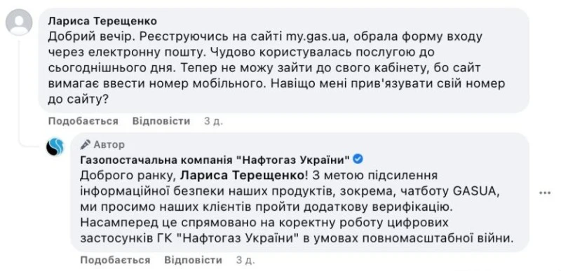 "З метою посилення інформаційної безпеки наших продуктів, зокрема, чатбот GASUA, ми просимо наших клієнтів пройти додаткову верифікацію. Насамперед це спрямовано на коректну роботу цифрових додатків ДК "Нафтогаз України" в умовах повномасштабної війни", - відповіли в компанії.