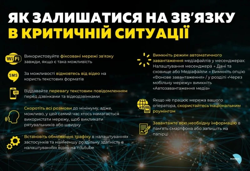 Також українцям радять завантажити всю необхідну інформацію в памʼять смартфона або записати на папірці. Варто віддавати перевагу текстовим повідомленням перед дзвінками та відеодзвінками.