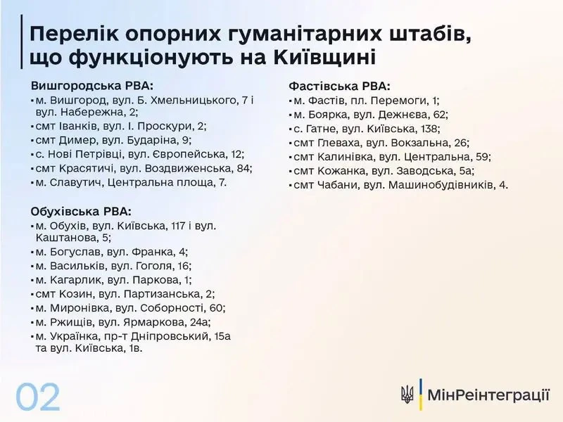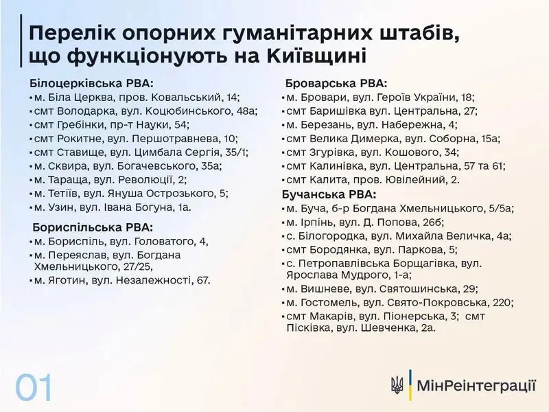 Як розповіли в Міністерстві з питань реінтеграції тимчасово окупованих територій, наразі в Київській області функціонують 48 таких штабів при семи районних військових адміністраціях.