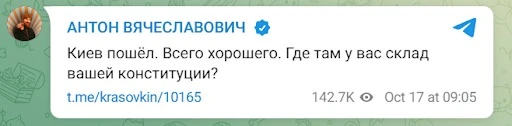 This is what another propagandist, Anton Krasovsky, wrote on the morning of October 17, when a mass attack by suicide drones was carried out on Kyiv, resulting in the death of four people, including a pregnant woman.