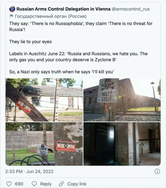 Активно використовують постановні фото і під час пропаганди в Росії. В червні російське представництво з контролю над озброєнням у Відні опублікувало твіт з фотографіями антиросійських наліпок на території концентраційного табору та музею Аушвіц-Біркенау в Польщі. Стікери, розміщені у музеї до 22 червня - у день нападу Німеччини на Радянський Союз, містили текст: «Росіє і росіяни, ми вас ненавидимо. Єдиний газ, на який заслуговуєте ви та ваша країна, — це «циклон Б» (який використовували для вбивств у концтаборах). Цей твіт поширило у своєму акаунті Міністерство закордонних справ Росії.