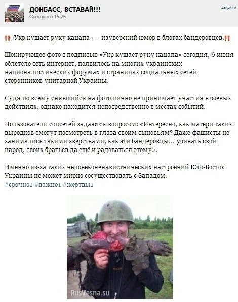 Ще в 2014 році на російських порталах з'явилася новина про те, що в блогах і соцмережах «бандерівців» поширилося фото, на якому зображений українець, що нібито поїдає руку росіянина.