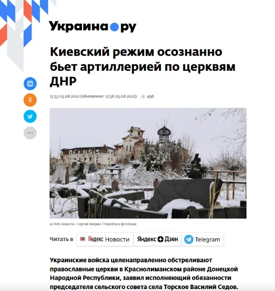 «Українські війська цілеспрямовано обстрілюють православні церкви у Краснолиманському районі Донецької Народної Республіки», – пише агітпроп.