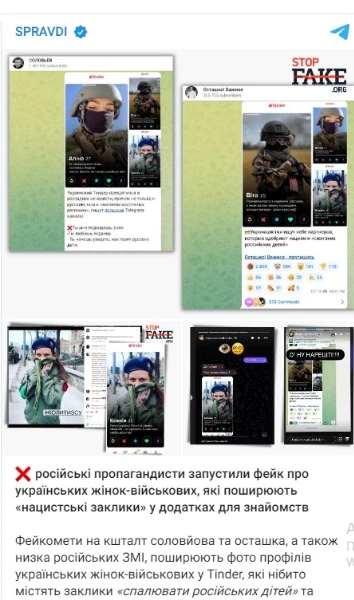 Ще під час повномасштабного вторгнення російські пропагандисти запустили фейк, що українські жінки-військові нібито поширюють нацистські заклики у застосунку для знайомств Tinder.