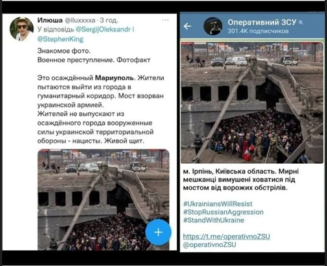 Російські ЗМІ створюють образ добрих російських військових, які не розстрілюють мирних українських громадян, а навпаки, намагаються створити гуманітарні коридори та вивести місцевих жителів із найгарячіших точок бойових дій. Наприклад, навесні російські ЗМІ опублікували фото зруйнованого ірпенського мосту, під яким місцеві жителі, чекаючи евакуації, ховалися від російських обстрілів. У версії російської пропаганди міст та люди опинилися в Маріуполі, а евакуацію зривала українська сторона.