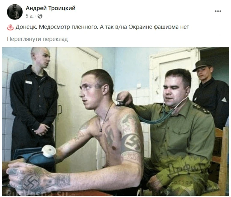 Також популярності набуло фото нібито огляду українського полоненого у Донецьку, на тілі якого видно татуювання із зображенням фашистської символіки. Утім, фото зроблено ще у червні 2005 року у білоруській в’язниці.