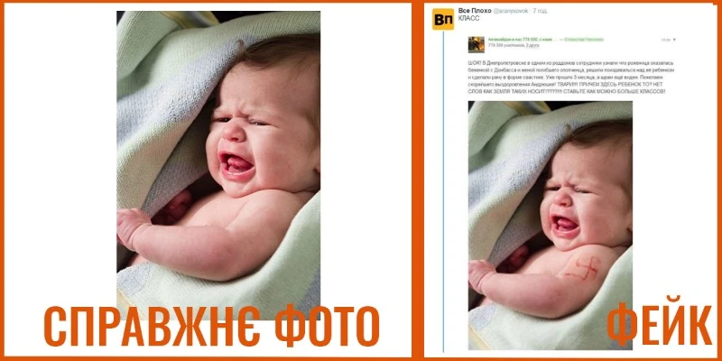 Це скріншот зі сторінки однієї з проросійських груп у російській соціальній мережі Vkontakte. Широко поширений знімок показує немовля, нібито зі свастикою на руці. На фотографії напис: “Шок! Персонал одного з пологових будинків у Дніпропетровську дізнався, що породілля була біженкою з Донбасу і дружиною загиблого солдата. Вони зробили рану у формі свастики на руці дитини. Минуло три місяці, а шрам ще видно“.