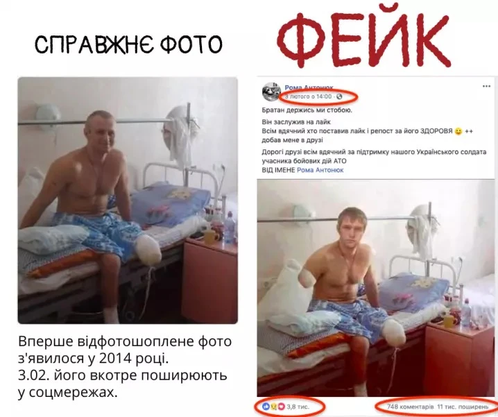 Також, у Facebook поширювалося фото з нібито українським військовим з важкими пораненнями, який перебуває у лікарні. Зображення супроводжувалося емоційним текстом з закликом поставити лайк та зробити репост. Як з’ясувалося, фото було оброблене. Це помітно за неприродним освітленням тіла «військового». Оригінал світлини з’явився у Facebook ще 2014 року.