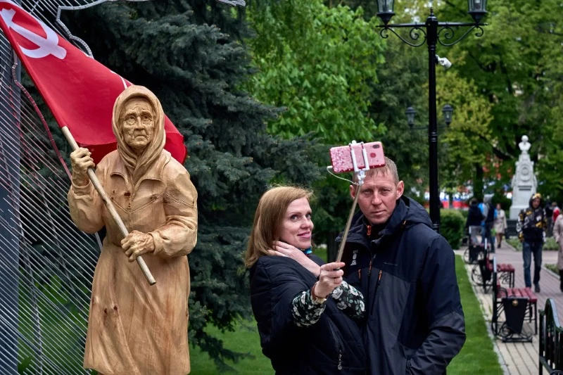 Сюжет із бабусею відразу перехопила російська пропаганда. На вулицях міст Росії розвісили рекламні банери з зображенням бабусі з червоним прапором. На 9 травня скульптуру бабці встановили в декількох містах Росії як новий символ підтримки дій армії РФ в Україні.